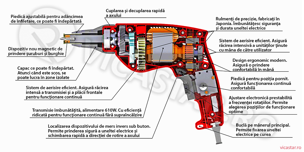 | -Localizarea dispozitivului de mers invers sub buton. Permite prinderea sigura a uneltei electrice şi schimbarea rapida a directiei de rotire a axului; |
